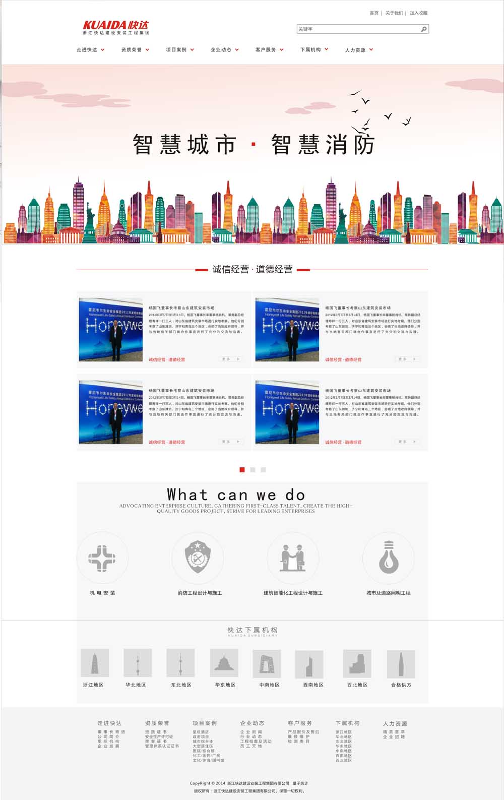 浙江快達建設安裝工程集團有限公司(原浙江快達安全工程有限公司)是承擔機電安裝、消防工程設計與施工、建筑智能化工程設計與施工的專業(yè)工程公司,具有機電設備專業(yè)承包壹級、消防設施工程設計與施工壹級、建筑智能化工程設計與施工壹級、安全技術(shù)防范行業(yè)資信等級貳級、城市及道路照明工程專業(yè)承包叁級資質(zhì)。公司在全國各地設立了20余個分公司或辦事處,并擁有專業(yè)生產(chǎn)火災自動報警系統(tǒng)的西安特靈電子有限公司。公司注冊資金7600萬元,員工2000余人,其中高級工程師12名,工程師51名,其它技術(shù)人員200余人;一級建造師15名,二級建造師15名,造價工程師1名,注冊安全工程師2名。目前公司為浙江省消防龍頭企業(yè),浙江省工商行政管理局“守合同重信用”AA級企業(yè),杭州市3A信譽企業(yè)和3A信用等級企業(yè),榮獲"全國安裝先進企業(yè)、"“全國安裝誠信企業(yè)”和“浙江省安裝行業(yè)誠信企業(yè)”等稱號。
